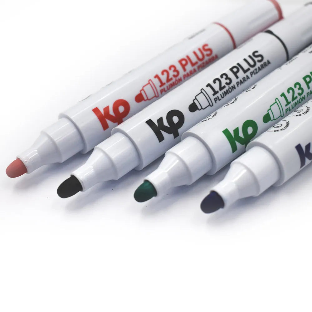 Set de 4 marcadores para pizarra 123 Plus con tinta de secado rápido y borrado fácil. Su punta biselada permite trazos precisos y visibles desde cualquier ángulo. Ideal para clases, presentaciones o reuniones. Disfruta de un rendimiento uniforme y colores intensos en cada uso.